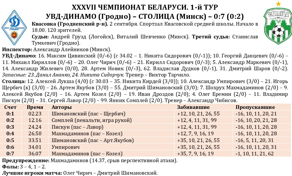 Старт чемпионата для «Столицы» удался. Выезд в Квасовку под Гродно не создал для дружины Александра Чибисова абсолютно никаких проблем. Обновленное «УВД-Динамо» нанесли по воротам гостей считанное число ударов, а в ответ получило 7 пропущенных мячей, чему руководители местного клуба оказались весьма рады. Ожидали больше. Впрочем, поездка в самую, пожалуй, проблемную точку на карте белорусского мини-футбола (отсутствие интернета для трансляции, душевых для футболистов) для «Столицы» уже позади. Одержана самая крупная победа в стартовом туре за всё время выступления в высшем дивизионе. Впереди – пропуск второго тура, спарринг с одним из любительских коллективов и домашняя игра 13 сентября с «Охраной-Динамо».