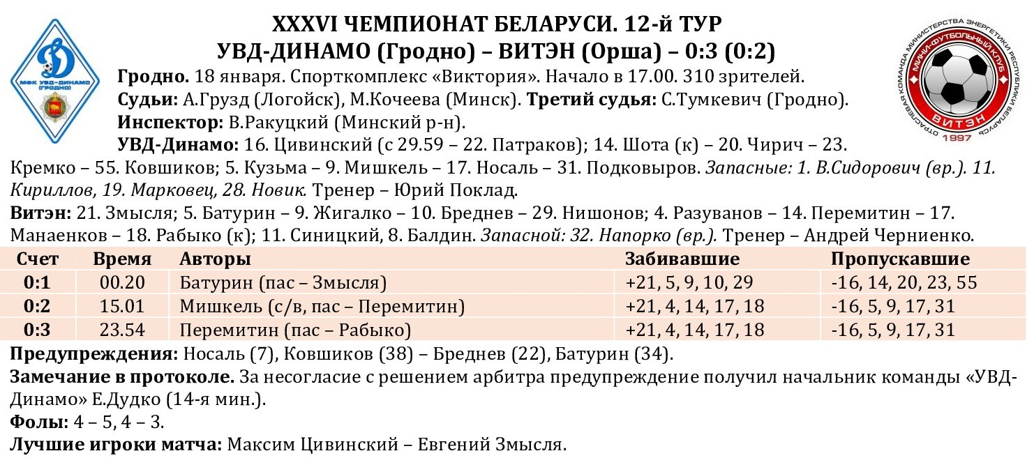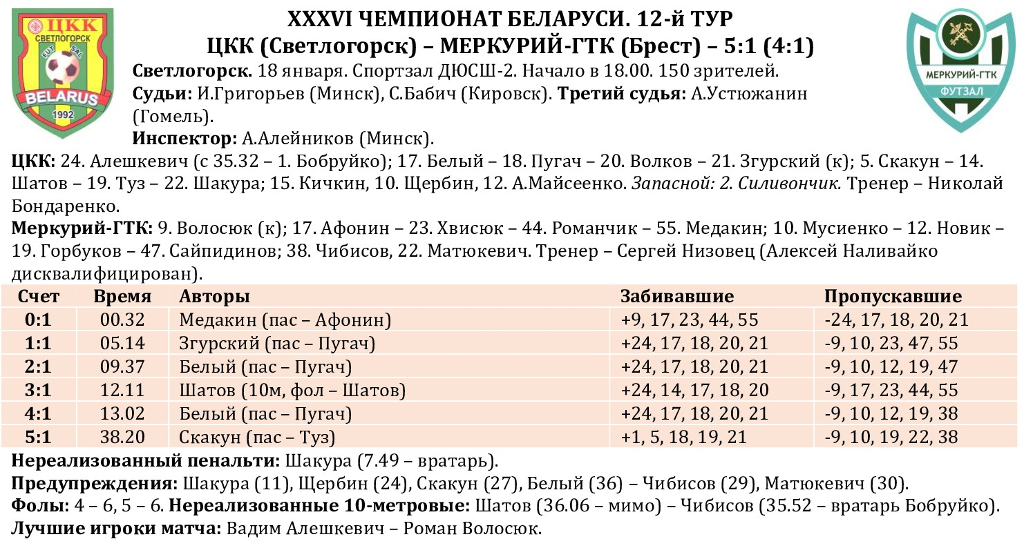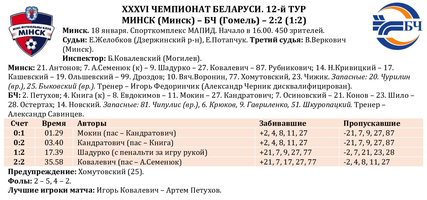 Продолжаем традицию подводить статистические итоги прошедших туров чемпионата страны. На очереди – первый в новом году и после межкруговой паузы 12-й тур. На сайте МФК «Столица» публикуем полную статистику состоявшихся матчей с указанием авторов голевых передач и данных по системе «плюс/минус», видеообзоры, а также символическую сборную, лучшего игрока, список лидеров среди бомбардиров, снайперов по системе «гол + пас», лучших по системе «плюс/минус», материалы прессы, подборку лучших голов тура. Вся информация о прошедшем туре собрана под одним заголовком в одном месте!