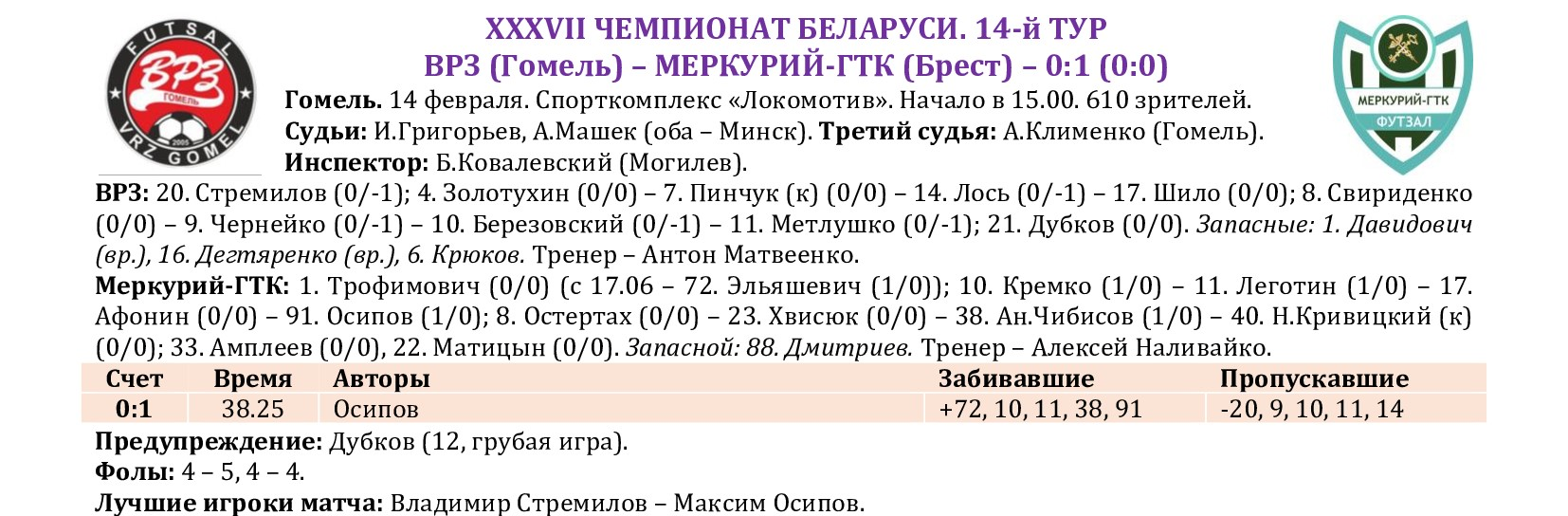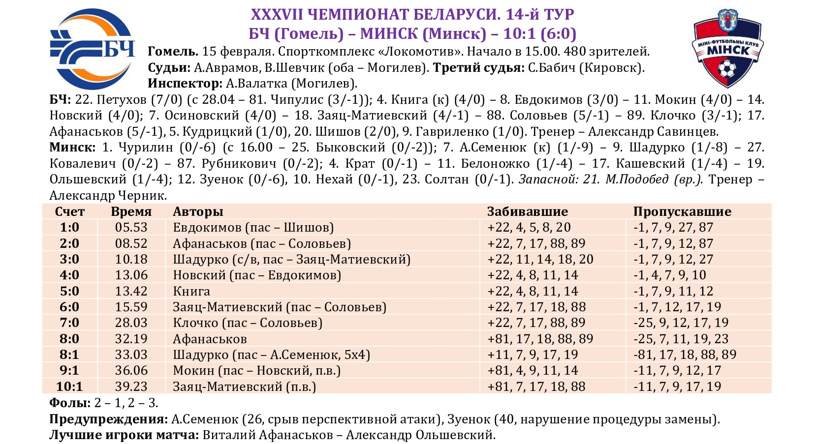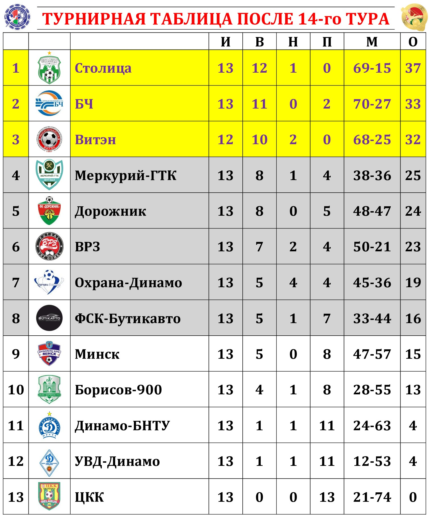 По традиции на сайте МФК «Столица» мы подводим итоги прошедшего тура с полной статистикой всех матчей, где указаны не только ассистенты при голевых «выстрелах», но и показатели по системе «плюс/минус» (статистический показатель полезности игрока, который отражает разность забитых и пропущенных командой мячей в то время, когда тот или иной игрок находился на площадке). Турнирная таблица, списки лучших бомбардиров, снайперов и самых полезных, символическая сборная, лучший игрок тура, ссылки на видеотрансляции, 10-ка самых красивых голов, выпуски телепрограмм «Ясно о мини-футболе» и «Пятый полевой» – вся информация о минувшем туре под одним заголовком!