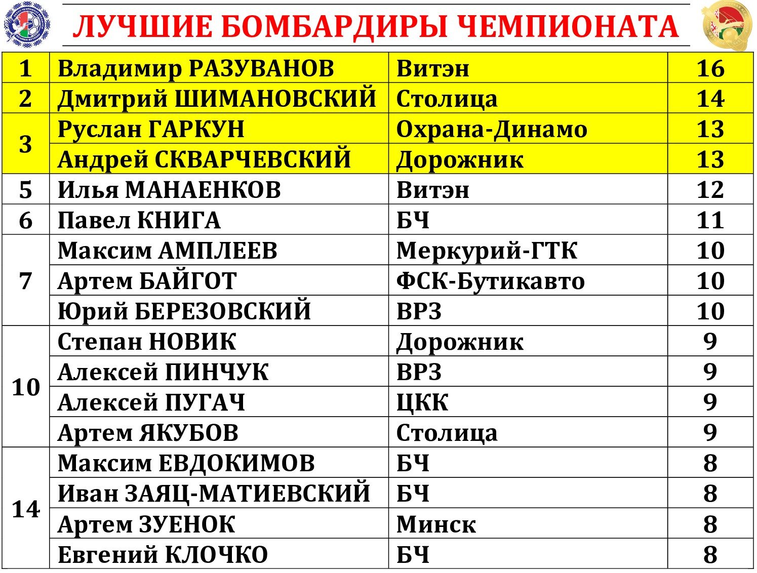 Денис ЛЕУ (Борисов-900); Дмитрий ШИМАНОВСКИЙ (Столица) – Виталий АФАНАСЬКОВ (БЧ) – Андрей СКВАРЧЕВСКИЙ (Дорожник) – Максим ОСИПОВ (Меркурий-ГТК)