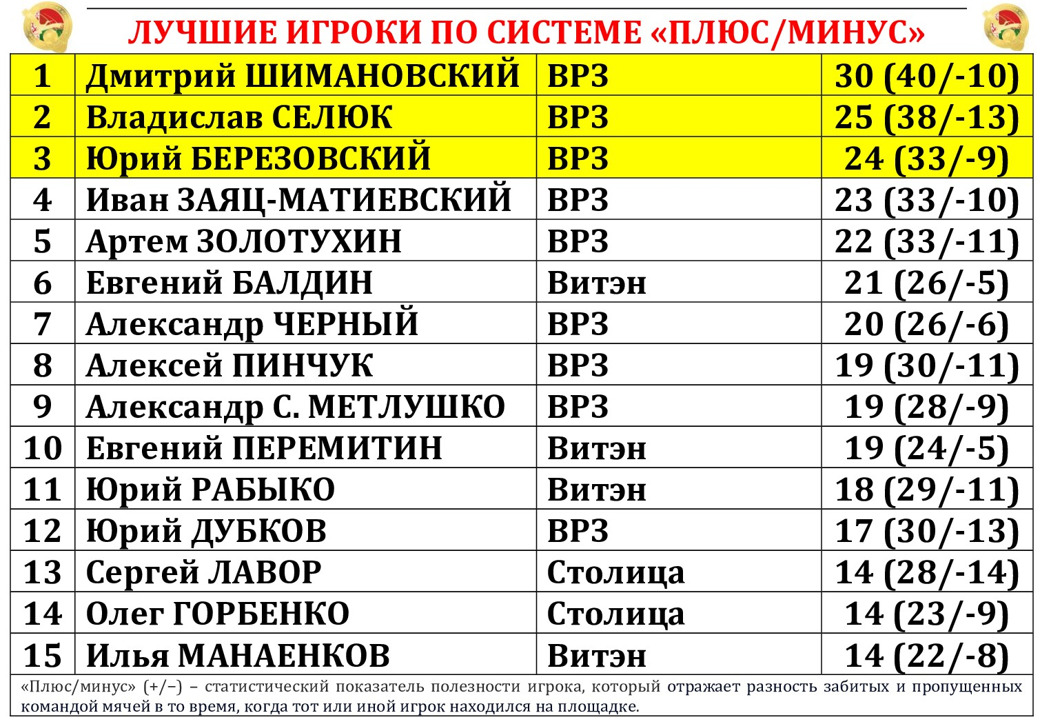 Продолжаем подводить статистические итоги прошедших туров чемпионата страны. На сайте МФК «Столица» публикуем полную статистику состоявшихся матчей 15-го тура с указанием авторов голевых передач и показателей «плюс/минус», видеообзоры, а также турнирную таблицу, символическую сборную, лучшего игрока, список лидеров среди бомбардиров, снайперов («гол + пас»), лучших по системе «плюс/минус», материалы прессы, подборку лучших голов тура, свежий выпуск «Ясно о мини-футболе». Вся информация о прошедшем туре собрана под одним заголовком в одном месте!
