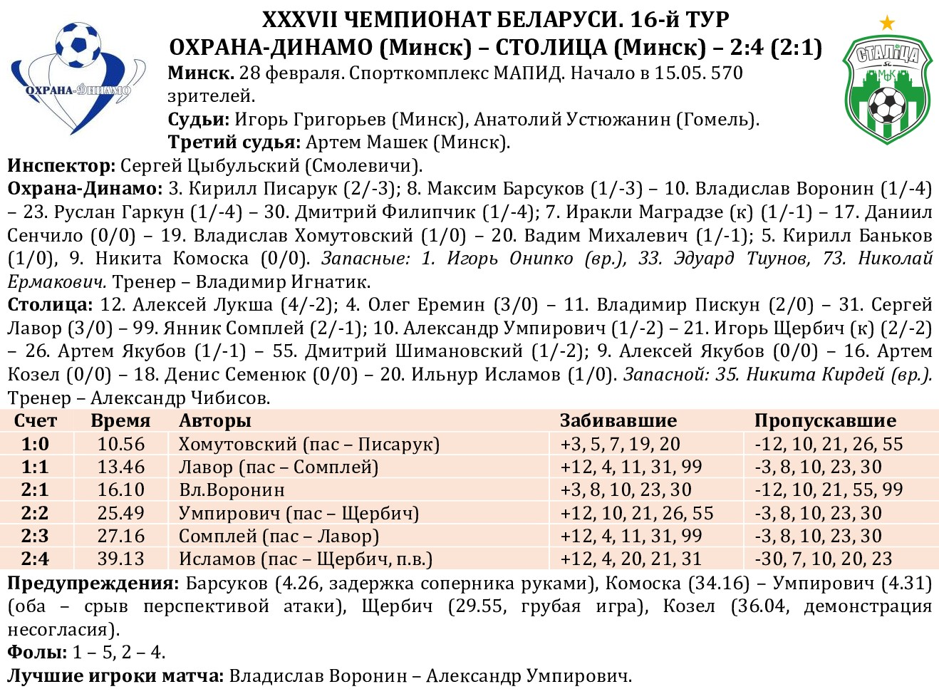 Результаты остальных матчей 16-го тура: 28.02. ВРЗ – ЦКК – 8:2 (4:2) (Дубков, 6, 37, Шило, 9, 36, Лось, 19, Чернейко, 20, Пинчук, 21, Березовский, 23; А.Майсеенко, 3, Н.Орехов, 5). БЧ – Борисов-900 – 7:2 (4:0) (Евдокимов, 2, Книга, 9, 20, Заяц-Матиевский, 13, Соловьев, 21, Тороп, 22-с/в, А.Ярош, 29-с/в; Носаль, 27-п, Керолиди, 40). Дорожник – УВД-Динамо – 4:1 (2:1) (Астафьев, 16, 18-п, Арешков, 32, 36; А.Новик, 20). Динамо-БНТУ – Минск – 0:5 (техн. поражение). 1.03. Витэн – Меркурий-ГТК – 2:3 (1:2) (Синицкий, 17, Раговик, 34; Осипов, 3, Ан.Чибисов, 4, Амплеев, 35).