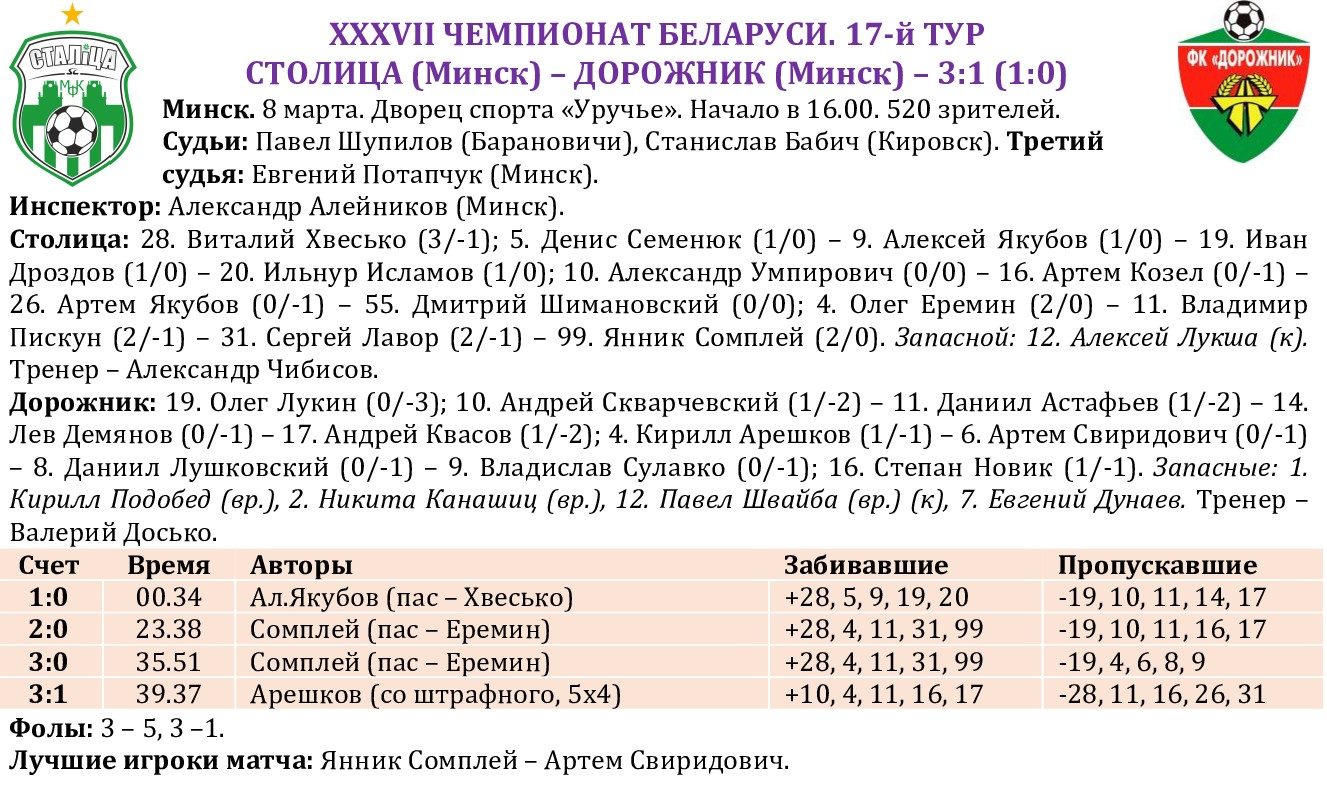 «Столица» в 10-й раз подряд обыграла в чемпионате земляков из «Дорожника». Весь матч Александр Чибисов использовал на площадке три квартета, предоставив шанс проявить себя всем футболистам. Уже на 34-й секунде Алексей Якубов открыл счет, пробив после передачи от голкипера с достаточно дальнего расстояния. А вот следующего взятия ворот пришлось ждать больше тайма. Янник Сомплей, голова которого не была забита цветочно-конфетными заботами, в своем фирменном стиле развернул соперника и пробил. Он же, как казалось, установил и окончательный счет, реализовав один из многочисленных розыгрышей угловых. Но «дорожники» за 23 секунды до сирены сумели забить мяч престижа: Кирилл Арешков результативно использовал прямой выстрел со штрафного. Для победы «Столица» приложила ровно столько сил, сколько было нужно. Остается только догадываться, на что она будет способна, если сыграет в настоящую силу. Возможность проверить это предоставится уже через неделю, когда «столичники» отправятся на берега Сожа в гости к набравшей крейсерский ход БЧ. Команды разделяет в таблице всего одно очко, поэтому в гомельском «Локомотиве» будет «вбит» безусловный «гвоздь» тура, а то и всего второго круга.