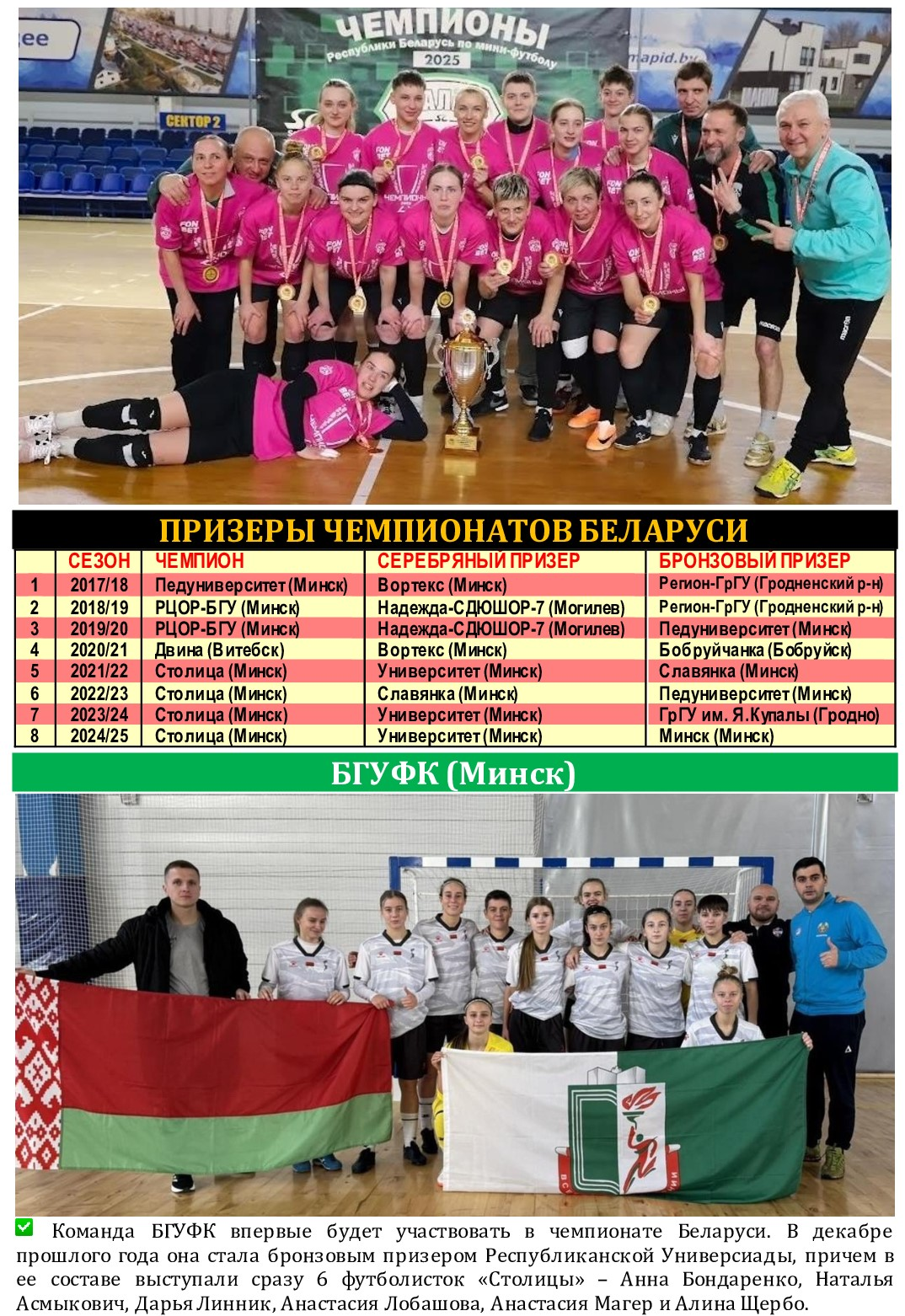В воскресенье, 7 декабря, стартует IX чемпионат Беларуси по мини-футболу среди женских команд. «Столица» вступает в него в роли действующего 4-кратного чемпиона, не потерпевшего пока в турнире ни единого поражения. В 12.20 в спорткомплексе МАПИД девичья дружина Сергея Кузнецова встретится с дебютантом первенства – студенческой командой БГУФК. В грядущем соревновании за медали сразятся только 6 команд, что на две меньше, нежели было в прошлом сезоне. Они проведут двухкруговой турнир, выявив победителя и призеров. К сожалению, УЕФА до сих пор не взялся за организацию женской Лиги чемпионов, что, несомненно, в разы повысило бы уровень и престиж национальных чемпионатов.