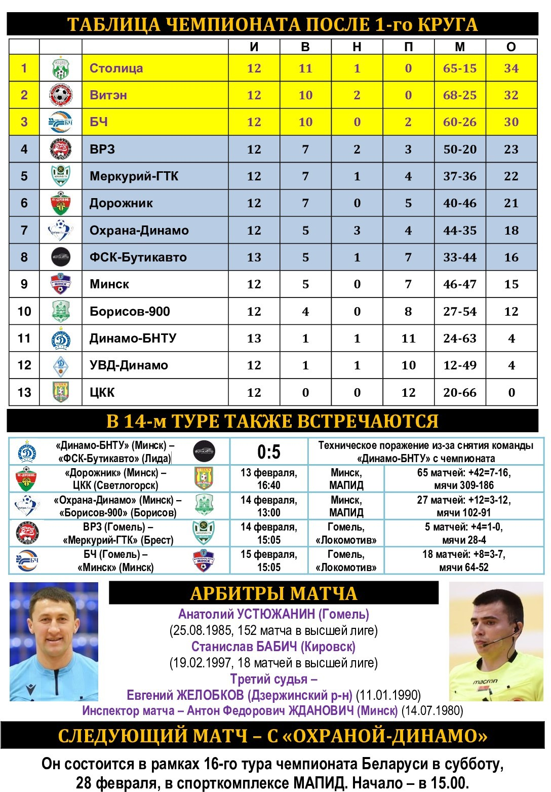 65-дневный (!) перерыв в чемпионате страны завершается. Отгремели кубковые и европейские баталии, возвращаемся к родному первенству. К сожалению, ряды его участников поредели. О снятии с турнирной дистанции объявило «Динамо-БНТУ», которому во всех матчах второго круга будут засчитаны технические поражения со счетом 0:5. Поэтому в каждом туре отдыхать будут по два коллектива: один – из-за нечетного поначалу состава высшей лиги, второй – получающий 3 очка без матча. Нет пока ясности и по светлогорскому ЦКК, но очень хочется надеяться, что эта команда не исчезнет с мини-футбольной карты Беларуси. Период дозаявок завершается 13 февраля. «Столица» решила вернуть к родным пенатах своего воспитанника Федора Шишкина из «Динамо-БНТУ». Потеря – минимальная, но к ней мы уже успели привыкнуть во время Кубка: Шохрух Махмадаминов еще в декабре попрощался с коллективом, отправившись покорять российскую Суперлигу в рядах нижегородского «Торпедо». Слухи о возможном уходе других футболистов так слухами и остались. Первым соперником «Столицы» после рекордного по длительности межкругового перерыва станет гродненское «УВД-Динамо». Дружина Виктора Тарчило в паузе пригласила из лидского «ФСК-Бутикавто» голкипера Вадима Сидоровича (теперь у «милиционеров» уже три (!) игрока с такой фамилией, плюс есть еще Сидорук), Константина Войцеховского и Никиту Карпука, а также бывшего футболиста «Щучина» Алексея Пилипчика. Покинул команду Георгий Данцевич, признанный в прошлом сезоне лучшим молодым игроком страны. Статистика предыдущих встреч свидетельствует о безусловном фаворитском статусе «Столицы», которая из 23 встреч с «УВД-Динамо» в 20 праздновала победу (одну из них – в серии послематчевых пенальти), однако для продолжения этой серии необходимо будет приложить на площадке умение и мастерство. Стать свидетелями возвращения нашей команды на национальную орбиту можно в субботу, 14 февраля. Матч будет транслироваться в прямом эфире на телеканале «Беларусь 5», однако настоящие болельщики всегда находятся рядом с командой. Тем более, что в фойе Дворца спорта «Уручье» можно будет подержать выигранный месяц назад Кубок страны и сфотографироваться с ним. Ну и по традиции поучаствовать в различного рода активностях и розыгрыше призов от клуба. Матч начнется в 14.00, но приезжайте пораньше. До встречи! Важны – кожны!