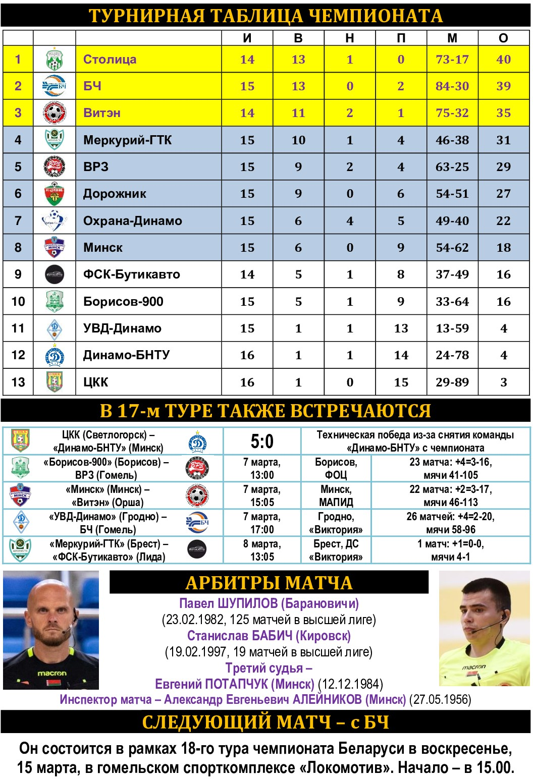 В Международный женский день 8 Марта «Столица» будет не только поздравлять своих любимых с праздников, но и подарит им яркий искрометный мини-футбол в своем исполнении! Поэтому давайте отметим этот погожий весенний денек вместе! Место нашей встречи неизменное – минский Дворец спорта «Уручье». В соперниках – заметно омолодившиеся земляки из «Дорожника». Если ранее это был элитарный ветеранский клуб, сугубо за «+30», то с приходом квартета футболистов из «Динамо-БНТУ» средний возраст команд заметно снизился. Хотя и на 44-м году бомбардир Андрей Скварчевский даст фору любому из молодых: с 14 забитыми мячами он входит в ТОП-4 чемпионата, деля третью строку со «столичником» Дмитрием Шимановским. «Дорожник» сейчас уверенно занимает 6-е место, в четырех последних матчах одержав 3 виктории (из этого ряда выбивается осечка в Борисове – 2:3, хотя по ходу дружина Валерия Досько вела – 2:0). «Выходной» на воскресенье сделали себе Игорь Щербич и Иван Рабцевич, «заработавшие» в прошлом туре по третьему «горчичнику» в чемпионате. «Столичники» готовят в воскресенье много разных конкурсов и подарков! Каждый болельщик получит скидочный купон на доставку суши! Первым ста посетителям вручат цифровые номерки и в перерыве среди них будут разыграны крутые подарки! Для держателей абонементов также предусмотрен розыгрыш эксклюзивного приза! Начало матча – в 16.00. Прямая трансляция на телеканале «Беларусь 5». Важны – кожны!