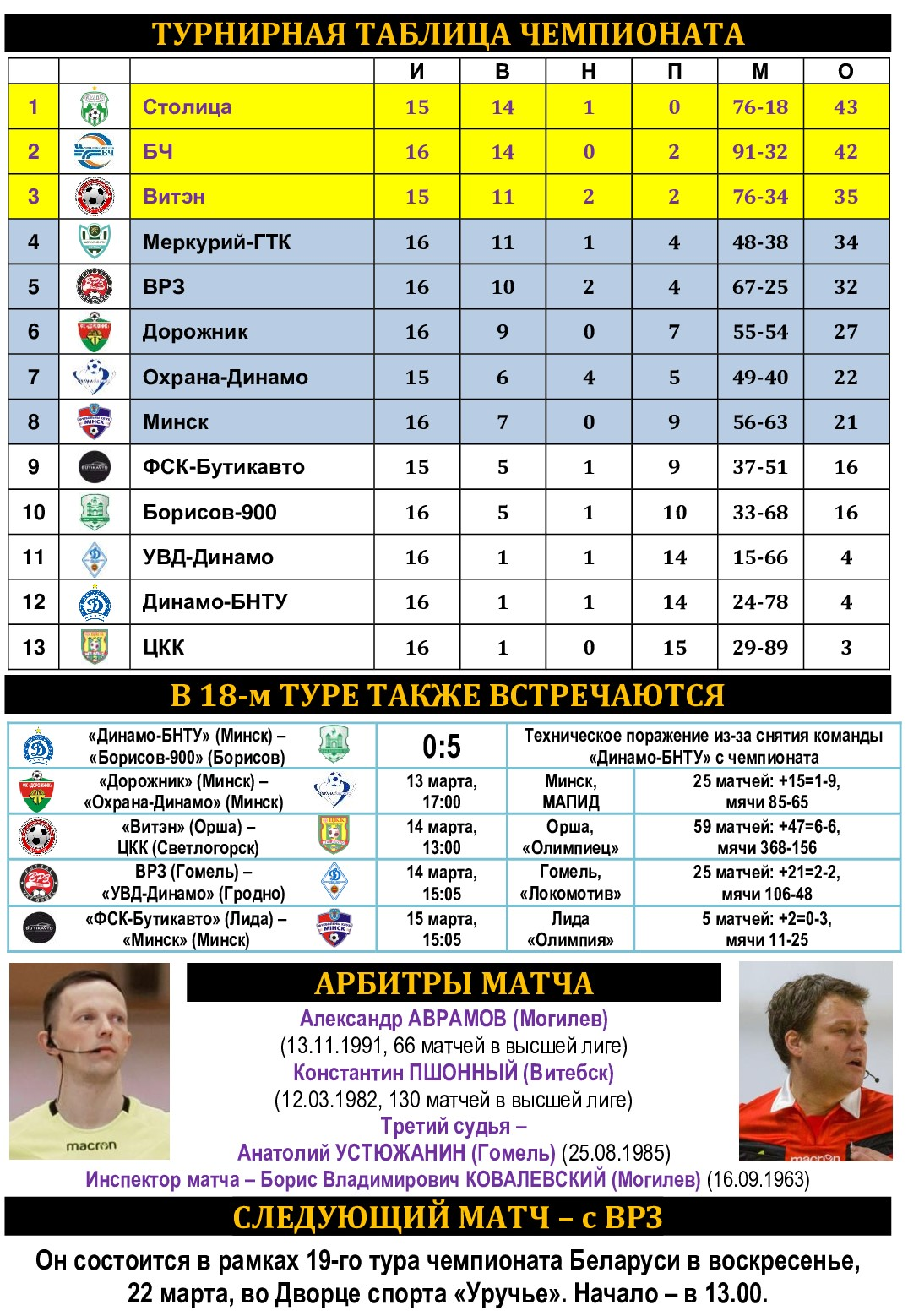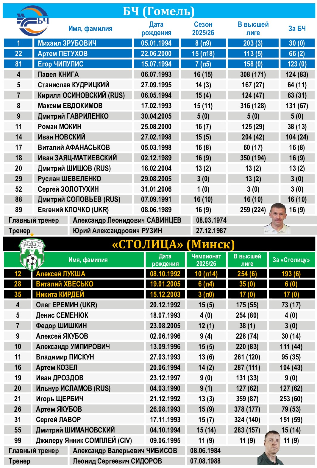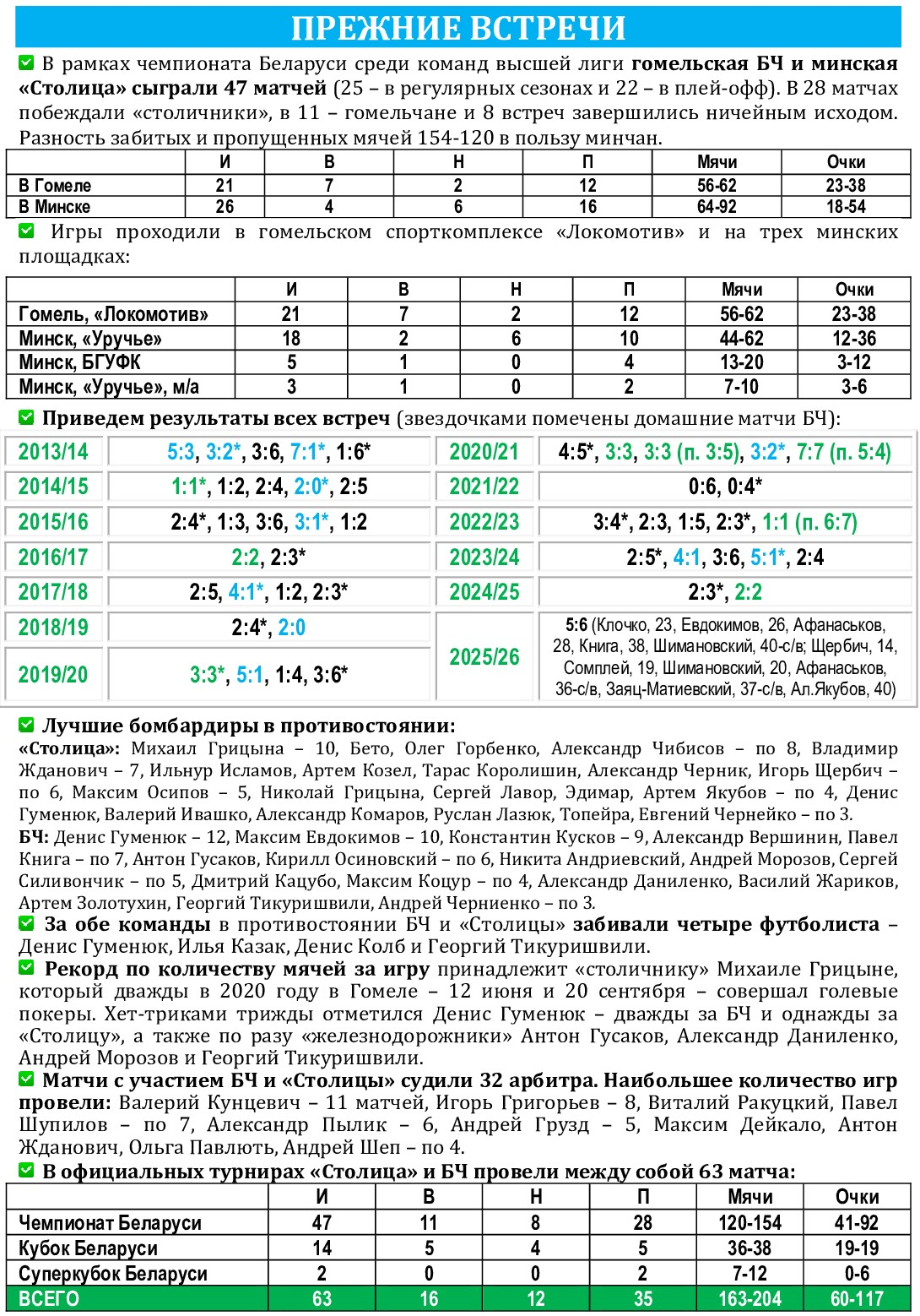 На сегодняшний день, БЧ – самая забивающая команда (в ее активе 91 мяч), а «Столица» – наименее пропускающая (18 голов). Причем после межкруговой паузы гомельчане в 4 матчах отличились 31 раз! Экс-«столичник», а ныне капитан БЧ Павел Книга лидирует в споре снайперов (по системе «гол + пас») с 29 очками и по показателю полезности – «+41». БЧ сейчас имеет два равноценных квартета и показывает весьма приличный уровень мини-футбола. Гомельчан возглавляет несколько лет проработавший в «столичных» структурах Александр Савинцев, которому есть что доказать в отечественном мини-футболе. Поэтому в воскресенье, 15 марта, в спорткомплексе «Локомотив» будет самая настоящая жара. Матч (его начало – в 13.00) будет транслироваться в прямом эфире на телеканале «Беларусь 5», но (знаем это стопроцентно) без болельщицкой поддержки «Столица» не останется и на берегах Сожа. Верим в команду!
