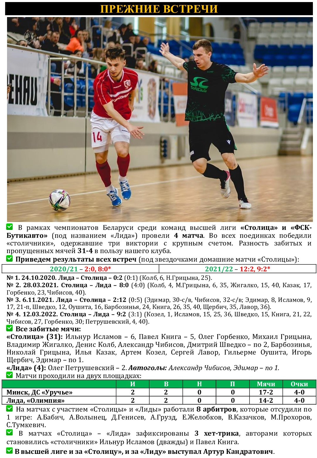 После паузы, связанной с кубковыми баталиями и учебно-тренировочным сбором национальной команды (в Столбцы выезжали три «столичника» – Александр Умпирович, Дмитрий Шимановский и Артем Якубов), возобновляется чемпионат страны. В воскресенье, 16 ноября, под прицелами телекамер канала «Беларусь 5» в 12.30 в минском Дворце спорта «Уручье» начнется матч 9-го тура национального первенства между «Столицей» и лидским «ФСК-Бутикавто». Команда из Гродненской области вернулась на республиканскую орбиту после трехлетней паузы, сменив в названии имя города на фирму-спонсора, коей стала сеть автосалонов «Бутикавто». Однако без поддержки городских властей дружина Игоря Зубко не осталась: местный Физкультурно-спортивный клуб (это нашло свое отражение в аббревиатуре «ФСК») также оказывает команде финансовую помощь. Ну и в заявке «ФСК-Бутикавто» на чемпионат значится сам мэр Лиды – Александр Людвигович Версоцкий, который на площадке так пока не появился, но трибунах лидской «Олимпии» – частый гость. Футболисты сторицей платят за проявляемое к ним внимание, находясь на 6-й позиции в турнирной таблице. Три победы кряду – достойный результат. Плюс нахождение во главе снайперского табеля Артема Байгота, наколотившего уже 9 мячей. Досадным недоразумением представляется кубковая осечка в Могилеве, где в рамках 1/16 финала случилось поражение от хотимского БЕЛиКОМа – 2:5. Не сыграет за гостей в воскресенье футболист первой четверки лидчан 21-летний Александр Куйжа, что наверняка станет головной болью для тренерского штаба соперника. Отметим, что из 19 забитых мячей – 16 (!) на счету стартового квартета (Якимец – Куйжа – Байгот – Живушко). У «Столицы» тоже есть проблемы, из-за травм под вопросом участие ряда футболистов, но скамейка запасных позволяет ротировать состав практически безболезненно. В пятницу, 14 ноября, жеребьевка 1/8 финала Кубка, на которой наш клуб узнает своего соперника (матчи – 27/28 декабря). Но до них еще далеко, а мы ждем всех наших болельщиков в воскресенье в армейском манеже! Важны – кожны! Болеем за «Столицу»!