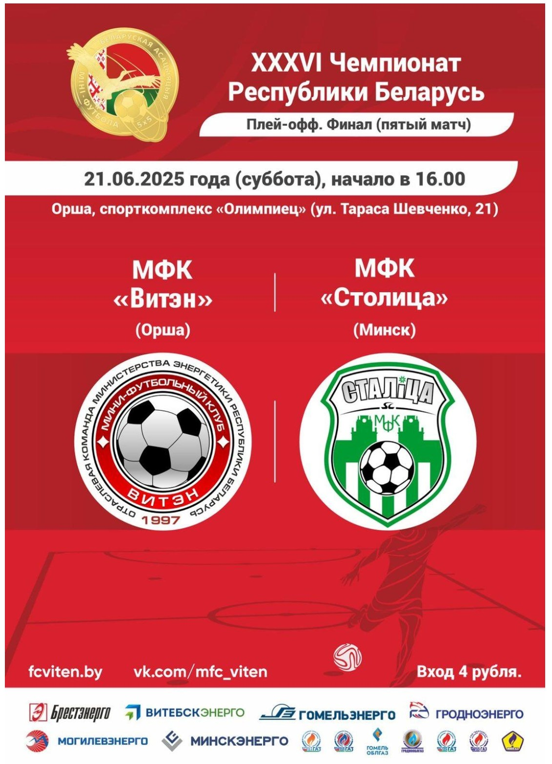 Последний бой – он трудный самый! 21 июня в Орше официально завершается XXXVI чемпионат страны. Интрига держится до самого последнего поединка. Кто станет победителем первенства и получит право представлять страну на международной арене в Лиге чемпионов? «Витэн» или «Столица»? Команды на двоих имеют 11 чемпионских титулов. «Столица» может завоевать 7-й трофей и стать единоличным лидером по числу завоеванных первых мест (сейчас 6 также имеет «Дорожник»). Или же их «Витэн» догонит и воцарится триумвират? На все вопросы ответ даст только Его Величество Игра, которая пройдет в субботу, 21 июня, в оршанском спорткомплексе «Олимпиец» и начнется в 16.00. Наверно, лишним будет напоминание, что все билеты на арену, официально имеющую 350 посадочных мест, были проданы за считанные минуты. И пусть в Орше по прогнозу ожидается дождливая погода с температурой +18, на площадке, уверены, будет жара. На стороне «Витэна» фактор домашней площадки, поддержка болельщиков и психологическое преимущество после уверенной виктории в Минске. «Столица» же жаждет сатисфакции за поражение 3-дневной давности. Александр Чибисов в одном из интервью признался, что его команда лучше играет на выезде, о чем свидетельствует и статистика: в нынешней серии за «золото» побеждали исключительно гости. За «столичников» сыграет и колоссальный опыт выхода из тяжких ситуаций: трижды кряду в чемпионатах после введения плей-офф не побеждал никто, а тут заход на четвертый круг. Не сможет помочь своим партнерам капитан минчан Игорь Щербич, заработавший дисквалификацию за перебор желтых карточек. Пока неясно, сможет ли сыграть пропускавший матч в Минске из-за травмы голкипер Алексей Лукша. Проблем хватает, а когда их не было?! «Столица» тем и сильна! На берега Днепра поболеть за нее собирается внушительный болельщицкий десант. «Столица»! Ты никогда не останешься одна! Верим в команду!