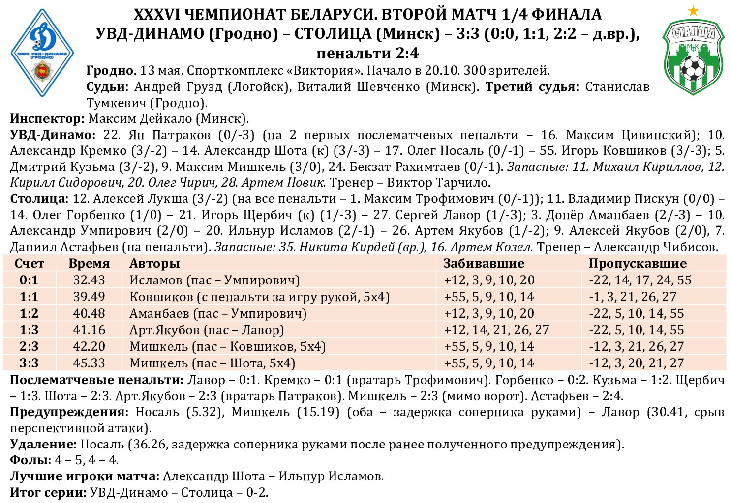 В гродненском матче составы команд были лишены по одной боевой единице. За «УВД-Динамо» не сыграл полученный из «Столицы» в полугодичную аренду Максим Амплеев, за минский клуб – дисквалифицированный на два матча Олег Еремин. Более получаса игрового времени счет не был открыт, хотя скучать заполнившим арену болельщикам не приходилось. Обе команды действовали в высоком темпе, часто угрожали воротам друг друга, неоднократно звенели штанги и перекладины, в поте лица трудились вратари. Размочил нули на табло джокер «Столицы» Ильнур Исламов. Уйдя на непривычный для себя правый фланг, он в своем фирменном стиле протащил мяч вперед (парадокс, но его никто не атаковал – Ковшиков и Рахимтаев, видно, понадеялись друг на друга!) и точно положил мяч в дальний от выдвинувшегося вперед голкипера хозяев угол. А когда за 3.34 до окончания второго тайма вторую желтую карточку увидел перед собой Олег Носаль, в итоговой победе гостей, наверное, уже никто не сомневался. Однако гродненцы сумели выстоять в меньшинстве, заменили вратаря пятым полевым игроком и за 12 секунд до сирены после прострела Александра Шоты мяч непостижимым образом нашел в «столичной» штрафной руку Игоря Щербича. Продолживший играть в майке «гонялы» Игорь Ковшиков хладнокровно реализовал пенальти, переведя встречу в овертайм.