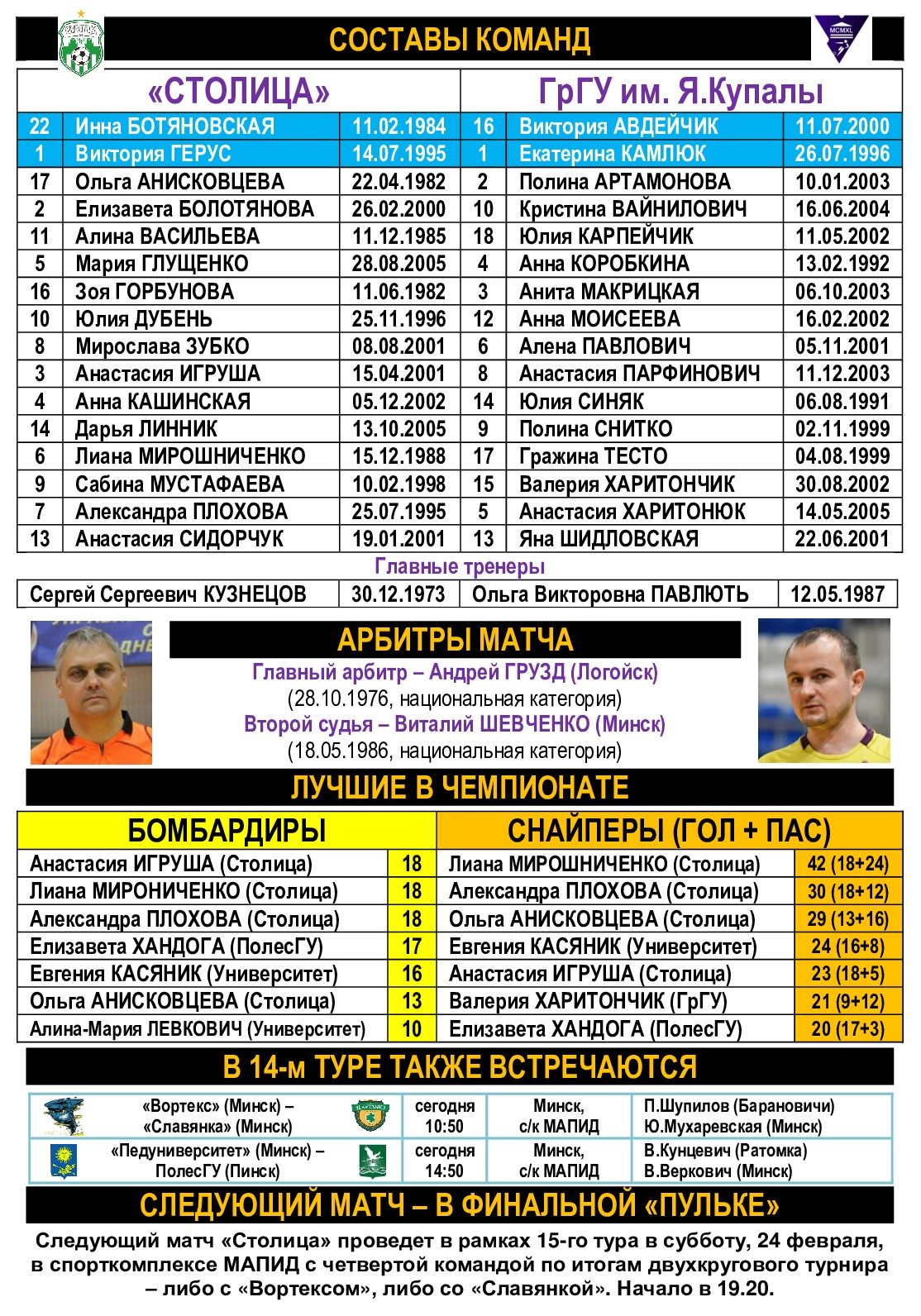 Женская лига. Анонс 14-го тура. «Столица» – ГрГУ им. Я. Купалы