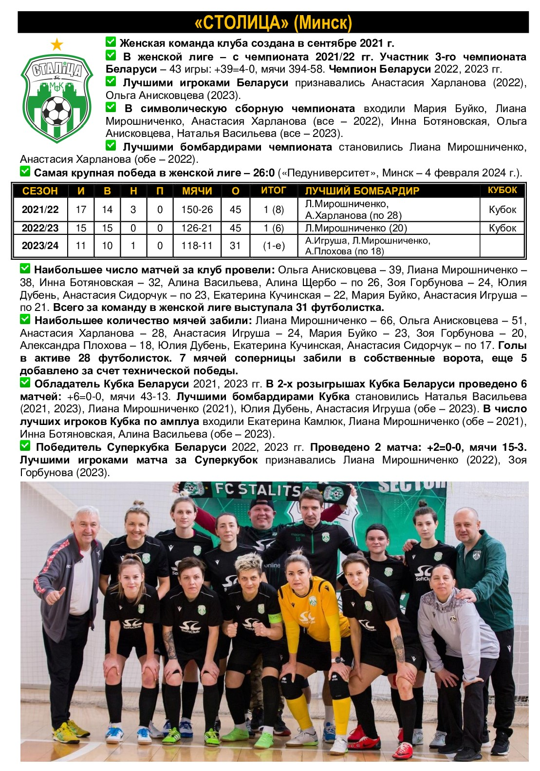 27.12.2023. ГрГУ им. Я.Купалы – Столица – 0:7 (0:1) (Мирошниченко, 14, Игруша, 24, Щербо, 32, 35-п, Пинчук, 35, Зубко, 38, Анисковцева, 39).