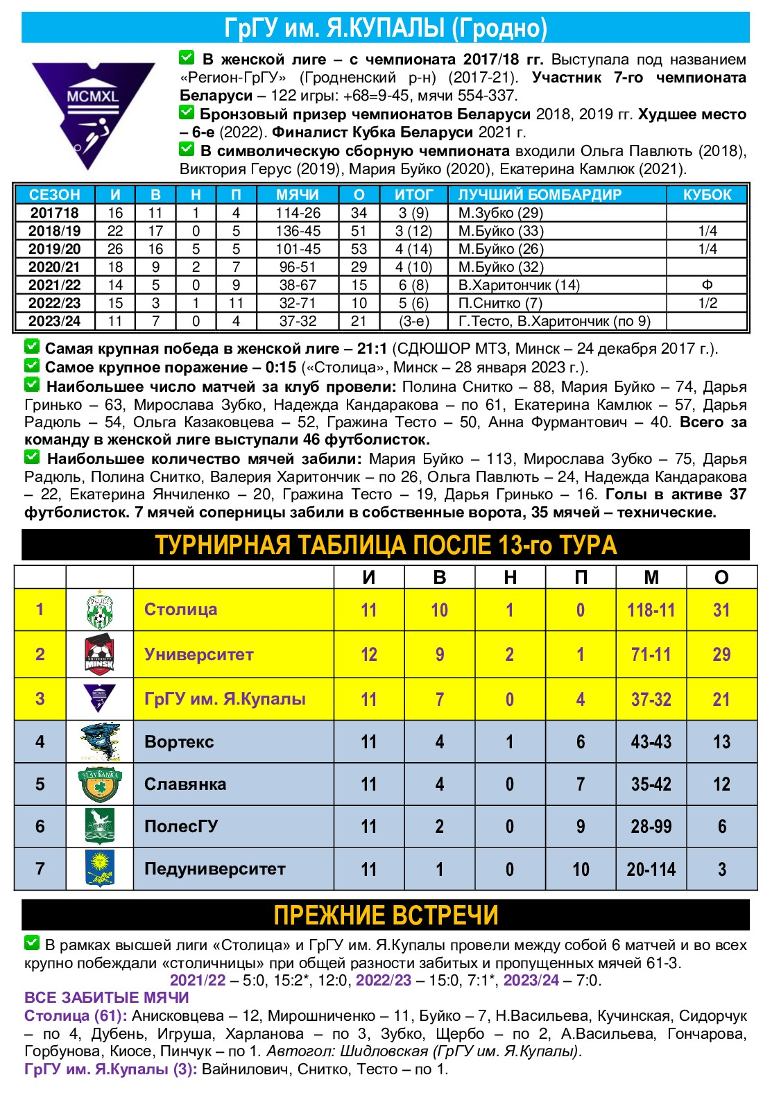 28.01.2023. ГрГУ им. Я.Купалы – Столица – 0:15 (0:4) (Мирошниченко, 2, 18, 23, 39, Анисковцева, 7, 18, 36, Горбунова, 29, Буйко, 32, 33, 38, Сидорчук, 36, 40, Шидловская, 37-с/в, Дубень, 38).