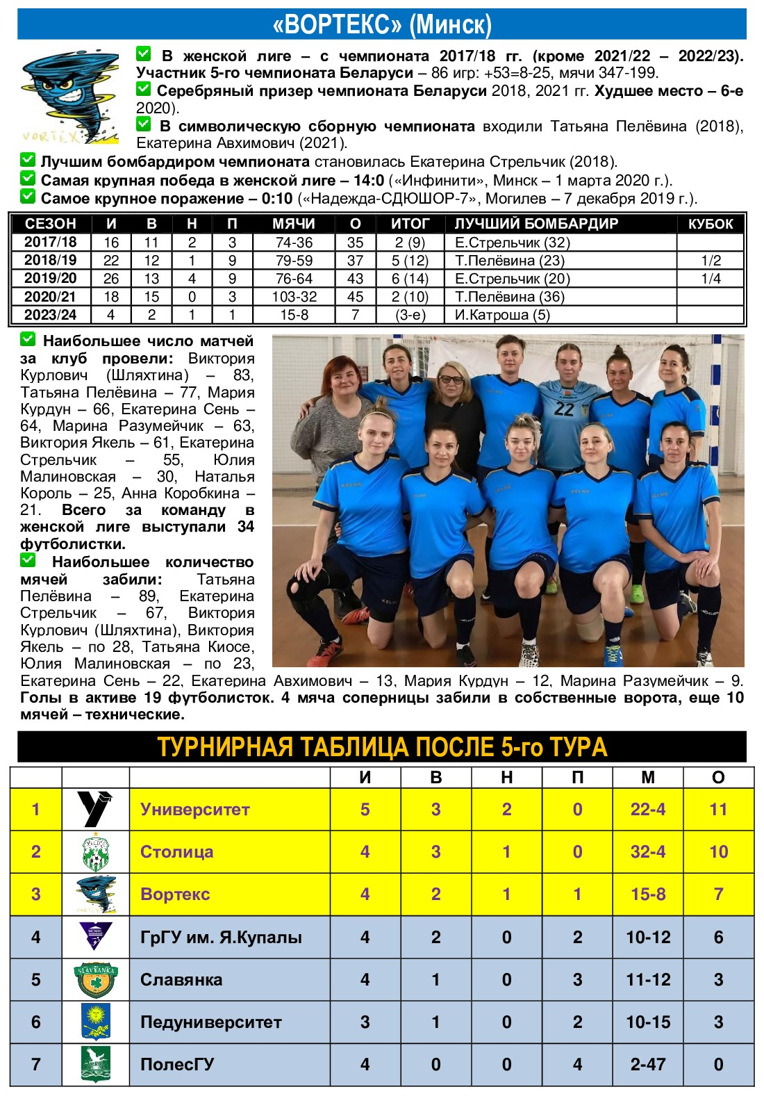 Положение команд после 5-го тура: Университет – 11 очков (5 игр), Столица – 10 (4), Вортекс – 7 (4), ГрГУ им. Я.Купалы – 6 (4), Славянка – 3 (4), Педуниверситет – 3 (3), ПолесГУ – 0 (4).