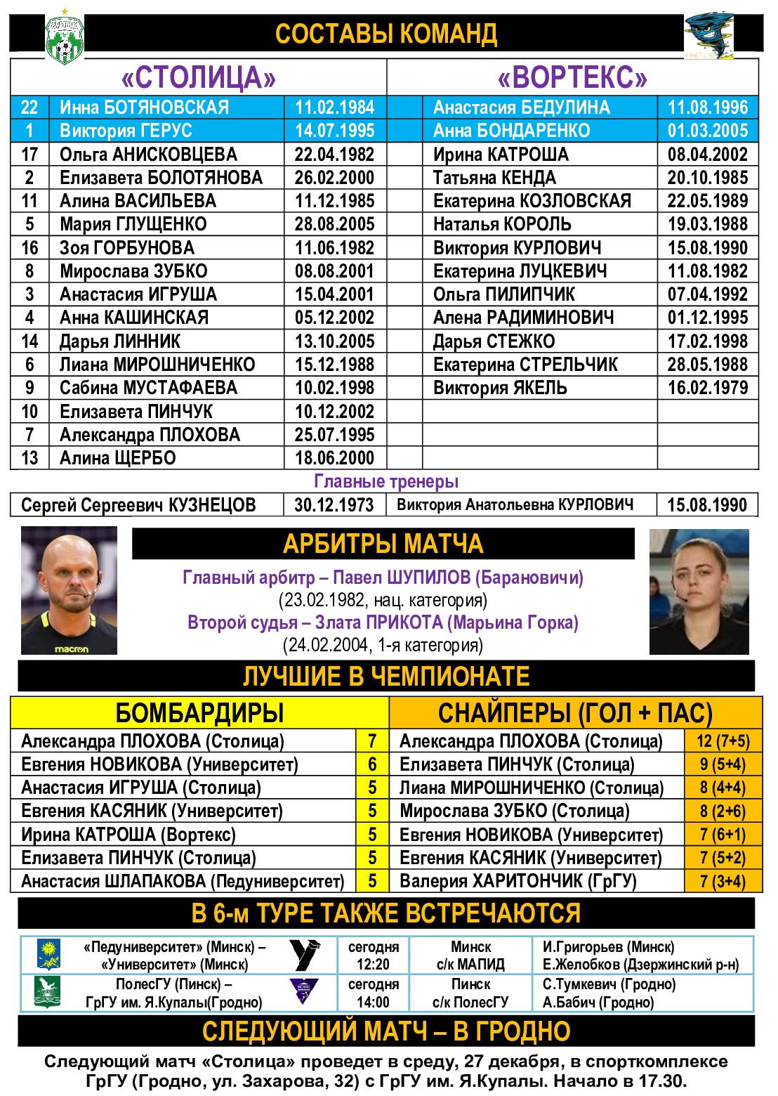 В других матчах 6-го тура также встречаются: 23.12. Педуниверситет – Университет (Минск, МАПИД, 12.20), ПолесГУ – ГрГУ им. Я.Купалы (Пинск, ПолесГУ, 14.00).