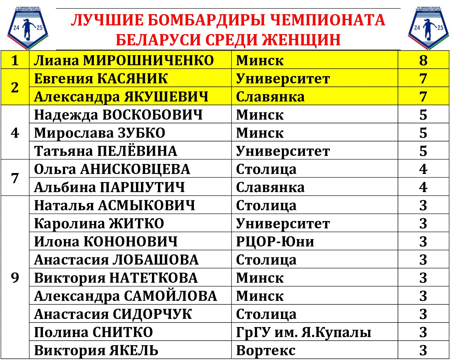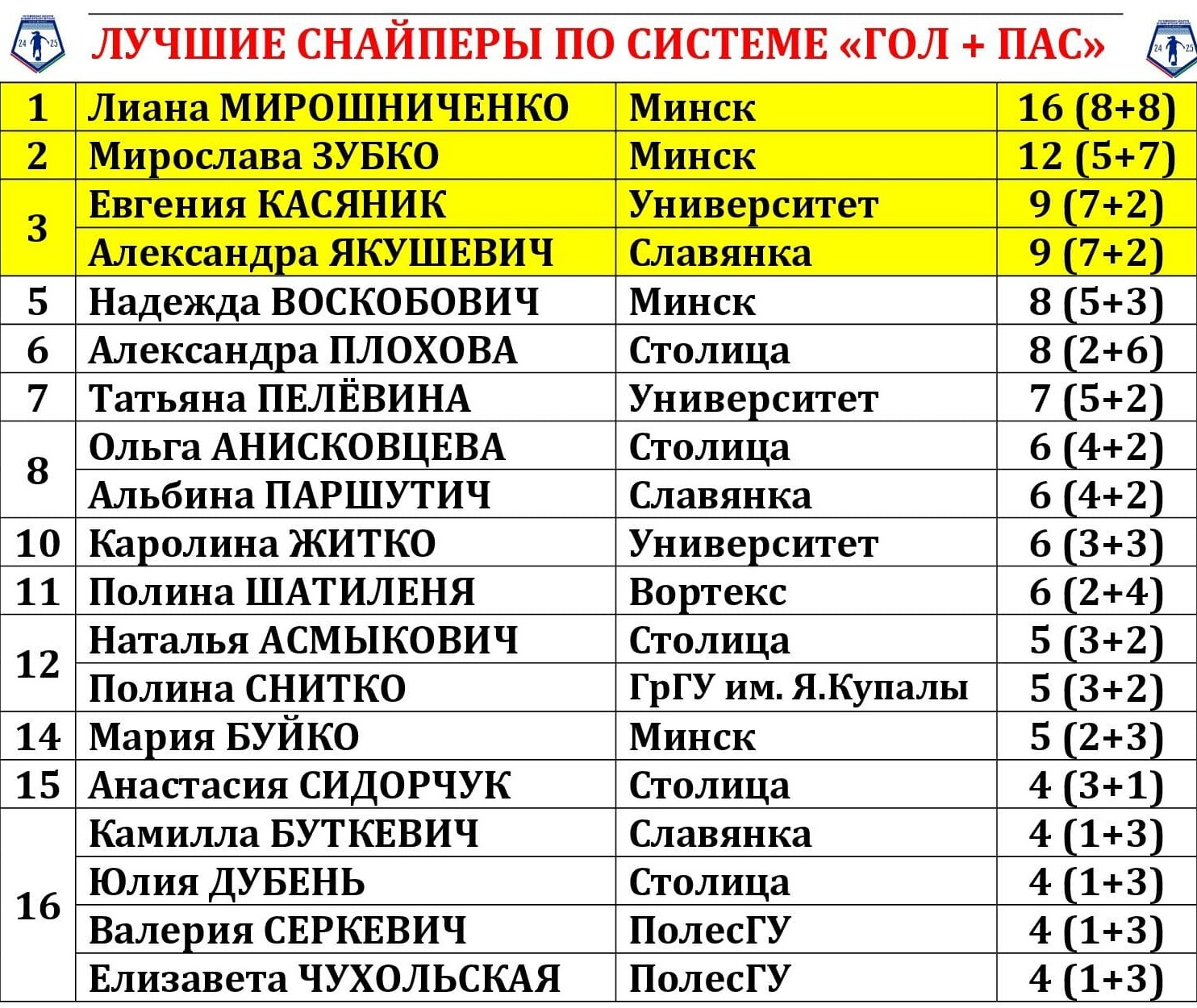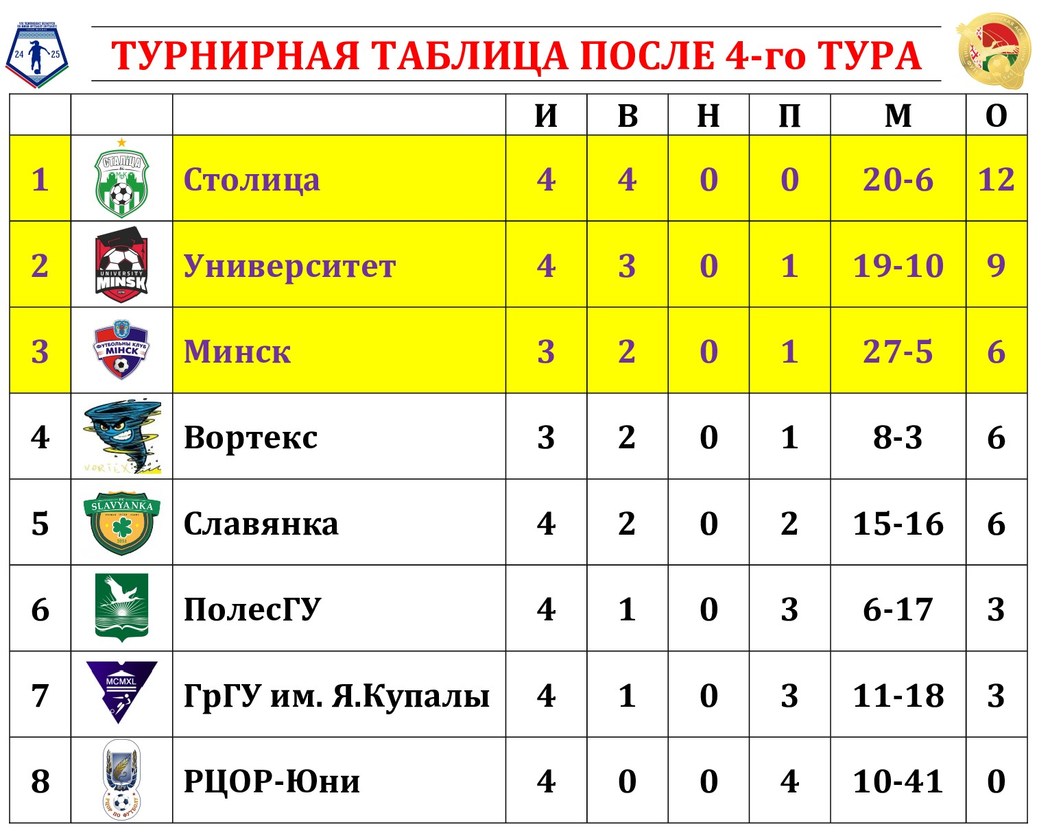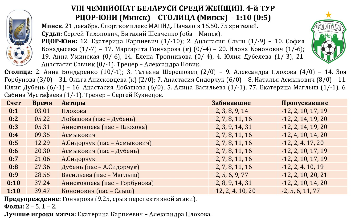 Результаты остальных матчей 4-го тура: 21.12. Славянка – Вортекс – 0:1 (0:1) (Якель, 7). ПолесГУ – Минск – 0:7 (0:4) (Мирошниченко, 5, 18, 20, Есьман, 11, Зубко, 23, Натеткова, 24, Воскобович, 27). 22.12. ГрГУ им. Я.Купалы – Университет – 4:6 (2:2) (Шидловская, 3, Снитко, 9, Синяк, 38, Харитончик, 39; Касяник, 14, 34, Пелёвина, 14, 32-п, 36, Житко, 29). Перенесенный матч 2-го тура. 23.12. РЦОР-Юни – Минск – 1:18 (1:4) (Кононович, 15; Самойлова, 4, 10, 39, Натеткова, 4, 24, Буйко, 12, 31, Мирошниченко, 22, 26, 30, 39, Зубко, 25, 26, 30, 37, Воскобович, 38, 38, 38).