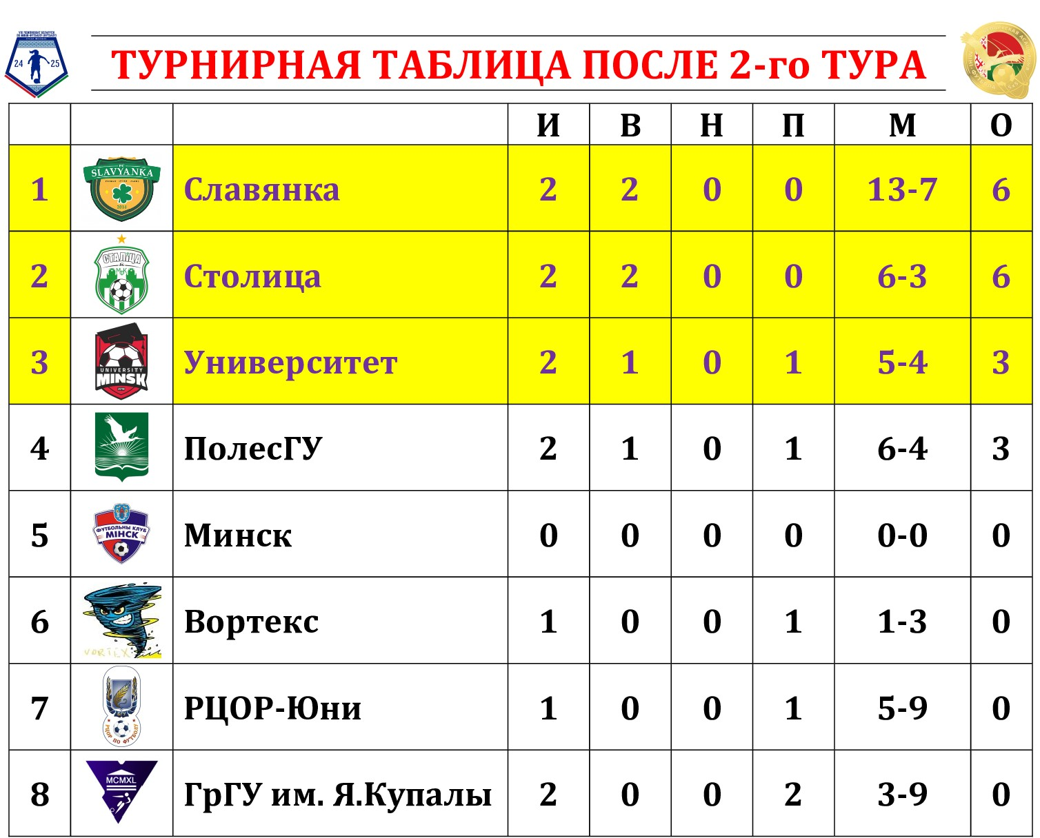 Результаты остальных матчей 2-го тура: 7.12. Славянка – ГрГУ им. Я.Купалы – 4:2 (0:1) (Завадская, 23, Якушевич, 26, 27, Конак, 28-п; Шидловская, 10, Авдейчик, 25). ПолесГУ – Университет – 1:3 (0:2) (Хандога, 34; Житко, 7, Пелёвина, 11-п, Касяник, 35). Матч РУОР-Юни – Минск перенесен на более поздний срок.