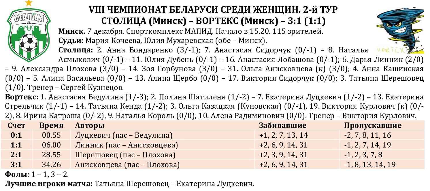 Прежде с «Вортексом» «столичницы» проблем не знали. В прошлом чемпионате все три матча были выиграны с общим счетом 28:2. Однако сейчас разгромить «вихревую» команду, дебютировавшую в VIII женском первенстве, не удалось. Уже на первой минуте дружина Сергея Кузнецова оказалась в роли отыгрывающейся. Буквально с центра площадки убежала в «одиночное плавание» Луцкевич и открыла счет. При подавляющем территориальном преимуществе «столичницы» сумели пробить голкипера соперниц только трижды. Все три гола в активе номинально второго квартета. Линник сравняла счет спустя пять минут, а затем более трети часа атаки «Столицы» разбивались о гранит обороны «Вортекса». Шерешовец решилась на дальний удар, и он получился! А затем Анисковцева расторопнее всех оказалась на пятачке, добив мяч в сетку. 3:1 – довольна натужная победа. Следующий матч – с «Минском», проигравшим «золотой» матч по футболу «Динамо-БГУФК» и только стартующим в мини-футбольном чемпионате.