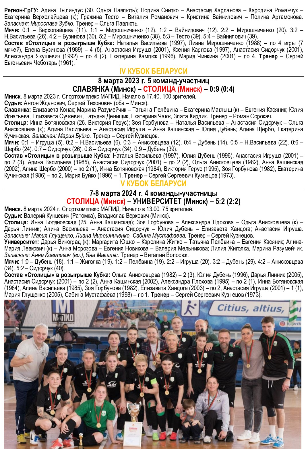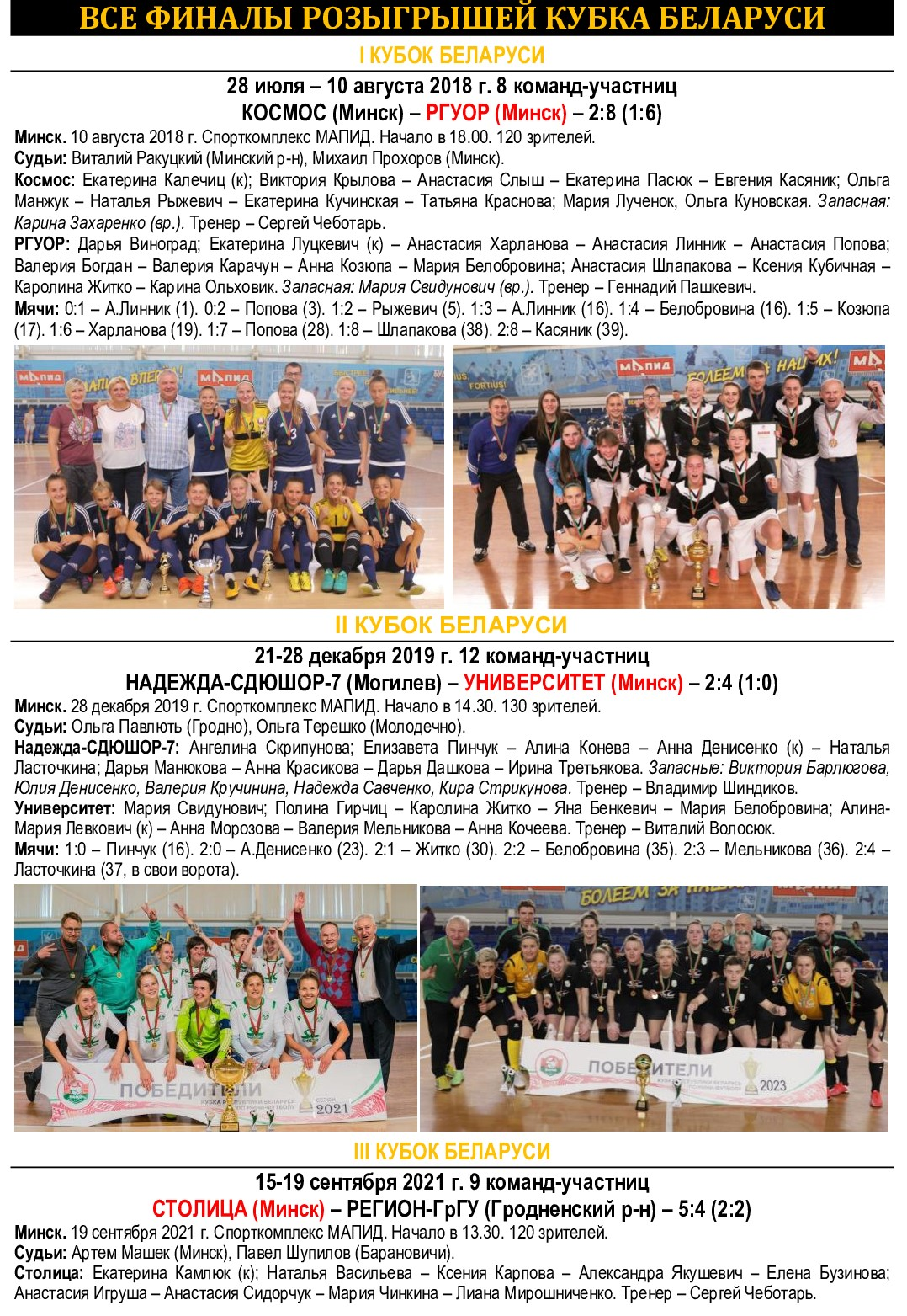 Лучшие бомбардиры Кубка: Валерия Мельникова (Университет) – 3, Ольга Анисковцева, Наталья Асмыкович, Анна Кашинская (все – Столица), Александра Цвирко (Университет) – по 2.