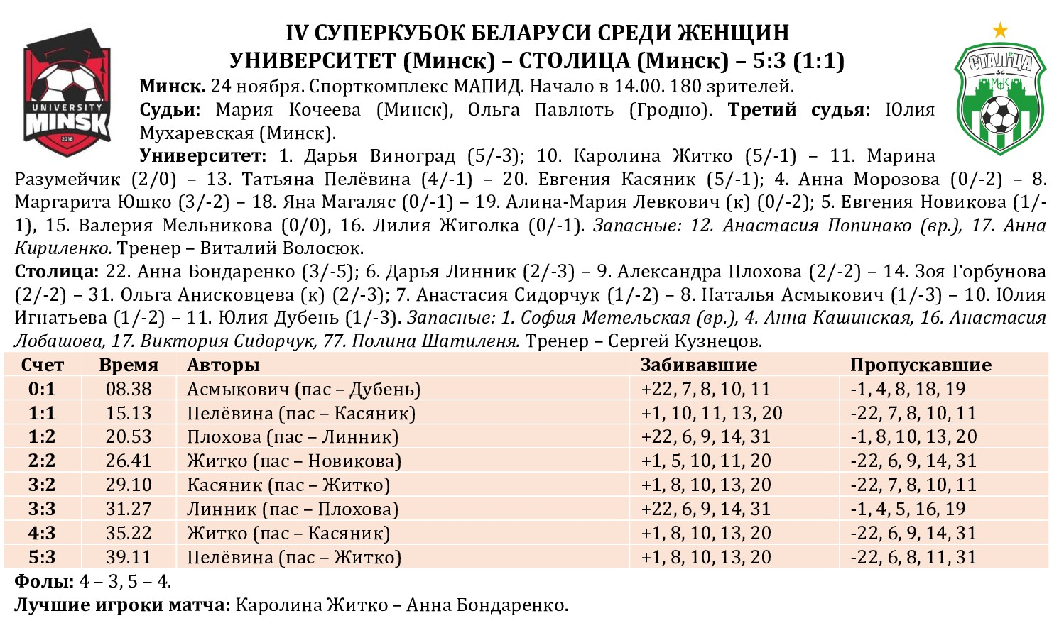 57 официальных матчей без поражений провела со дня основания женская «Столица». Понятно, что непобедимых команд не бывает, и рано или поздно проигрыш бы произошел. И случился он в стартовом матче сезона за Суперкубок, в котором наша обновленная команда соперничала со своим главным конкурентом последних лет – «Университетом». В межсезонье «Столица» существенно изменила свои ряды. Ушли из команды оба вратаря – Инна Ботяновская и Виктория Герус, а также Лиана Мирошниченко, Анастасия Игруша и Мирослава Зубко. Практически все они станут игроками вновь выходящего на женскую мини-футбольную орбиту «Минска». Пришедшим же новичкам предстоит притереться к команде, ознакомиться и принять проповедуемые тренером Сергеем Кузнецовым тактические наработки. Нужно время, но его катастрофически мало. Конкуренция за место в составе приличная, и в воскресенье не попали в состав, казалось бы, незыблемые игроки основы Алина Васильева и Елизавета Болотянова. «Столичницы» дважды вели в счете, потом отыгрывались. При счете 3:3 имели три классных момента для выхода вперед, однако судьба-злодейка в этот день от нашей команды отвернулась. Пропустили в контратаке, бросились сравнивать, и снова «оборотка». Обидное поражение. Но уже через неделю предоставится возможность взять реванш. «Столица» и «Университет» снова встретятся друг с другом, на этот раз в стартовом туре чемпионате, в котором примут участие 8 команд.