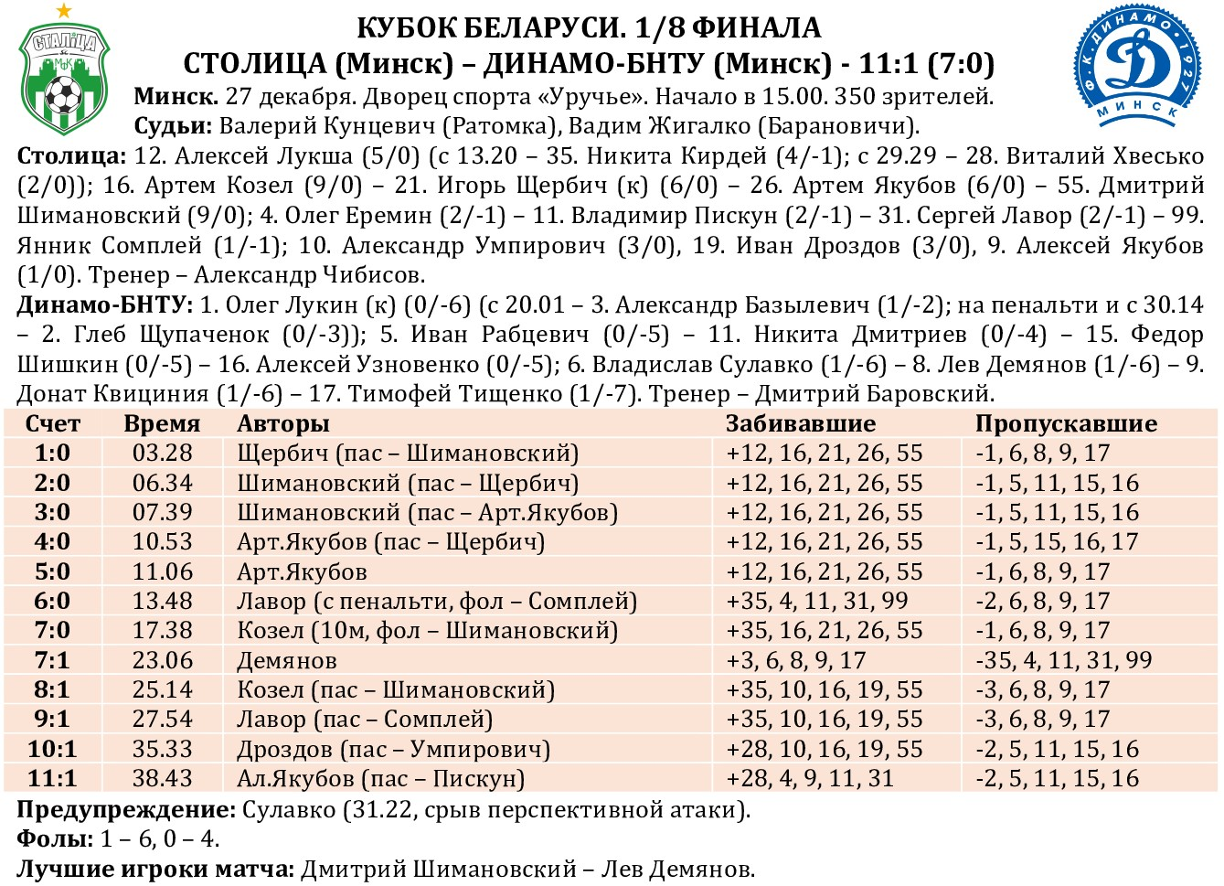 До субботнего матча самой крупной кубковой победой «Столицы» была виктория над любительской «ЧехОрдой» Алексея Чеховского – 10:2, одержанная два года назад. А вот на матч с «Динамо-БНТУ» «столичники» настроились по-боевому, не дав повода усомниться в своем превосходстве. «Политехники», обозначившие свое снятие с чемпионата по причине отказа финансирования от ФК «Динамо-Минск», хотели на прощание «хлопнуть дверью», но класс и уровень мастерства соперничавших команд оказался весьма разительным. Сразу четверо «столичников» отметились дублями – Дмитрий Шимановский, Артем Якубов, Артем Козел и Сергей Лавор, причем Шимановский и Козел завершили матч просто с уникальным показателем полезности – по +9 (он рассчитывается по нахождению на площадке при забитых/пропущенных мячах). В понедельник состоялась жеребьевка четвертьфинального этапа. «Столице» достался самый грозный соперник из возможных – гомельская БЧ. Матчи пройдут 4 января в Минске и 7-го – в Гомеле. Победитель этой пары в полуфинале (10 января в «Уручье») сразится с сильнейшим в противостоянии «Меркурия-ГТК» и «Охраны-Динамо». Финал запланирован на 11 января.
