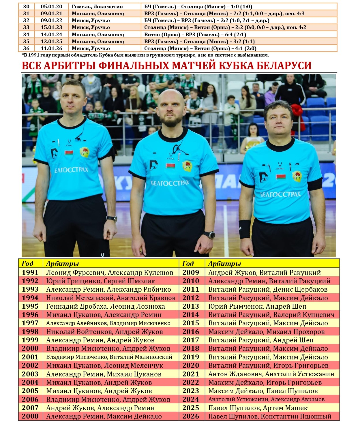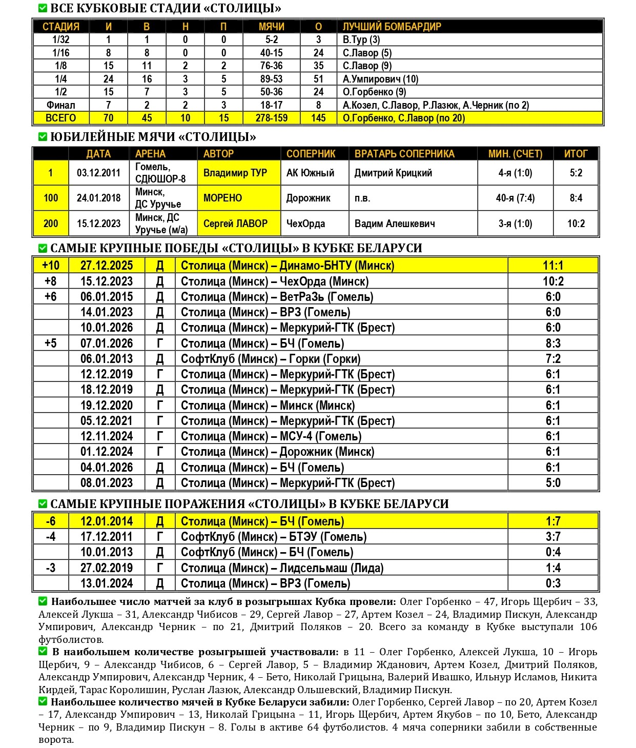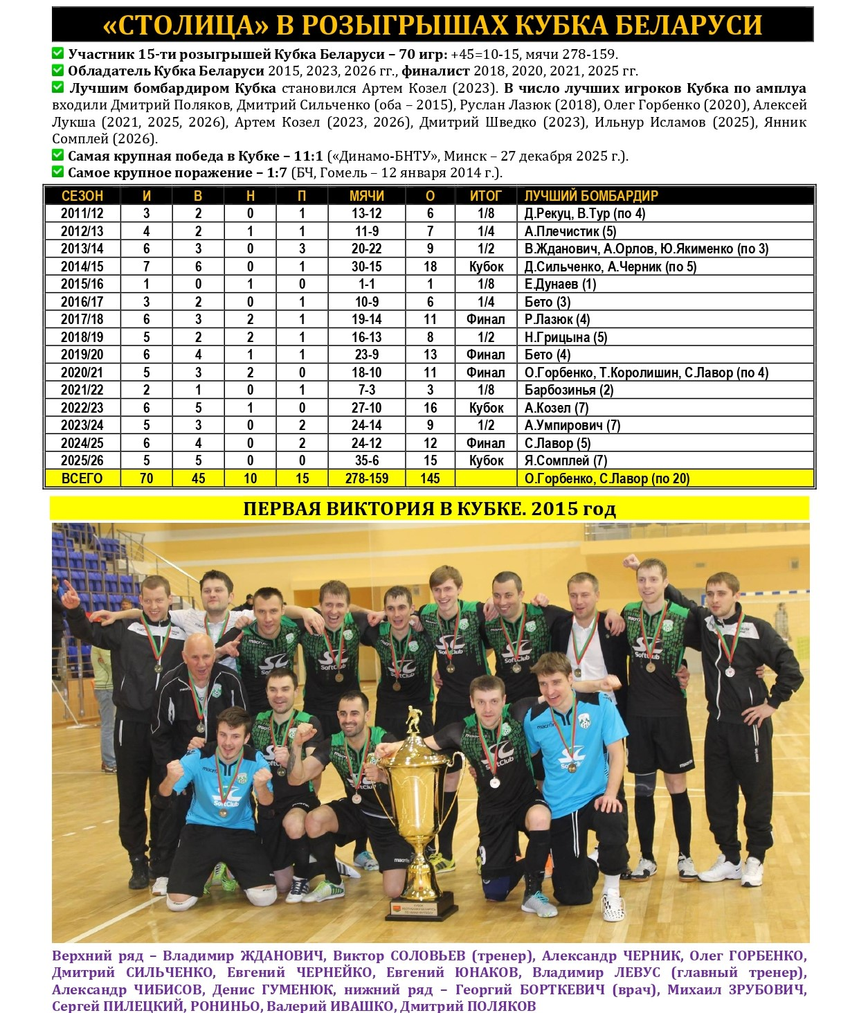 Не так давно «Столица» в третий раз в своей биографии стала победительницей Кубка Беларуси по мини-футболу. Предлагаем вашему вниманию большой статистический материал, посвященный итогам XXXVI розыгрыша Кубка с акцентом на выступления в нем нашей команды, а также подведем итоги 15-летней истории «дружбы» «Столицы» с этим турниром. Раскладка результатов по сезонам, лучшие бомбардиры, «долгожители», все соперники, города и судьи. Читаем и анализируем!