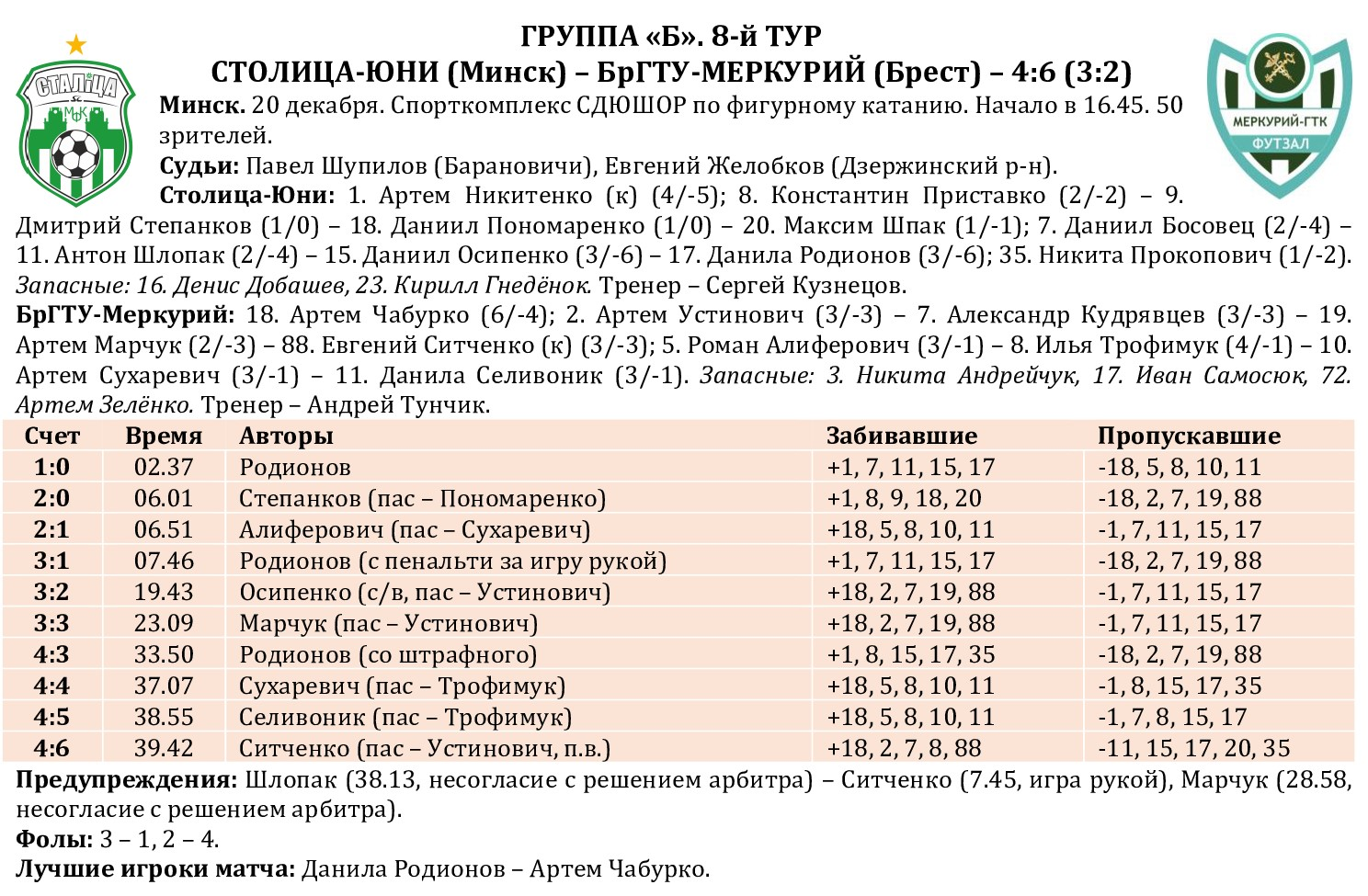 Результаты остальных матчей 8-го тура: 22.12. УВД-Динамо-Юни – Дорожник-Юни – 4:4 (2:0) (Сакута, 5, 40, Завражный, 18-с/в, Кирдик, 35; Савченко, 25, 29, 31, Завражный, 26). Школа футзала – Минск-Юни – 1:5 (0:3) (Маюк, 26; Вурганов, 2, Шауро, 13, Щелкун, 14, 23, Хмылко, 34).