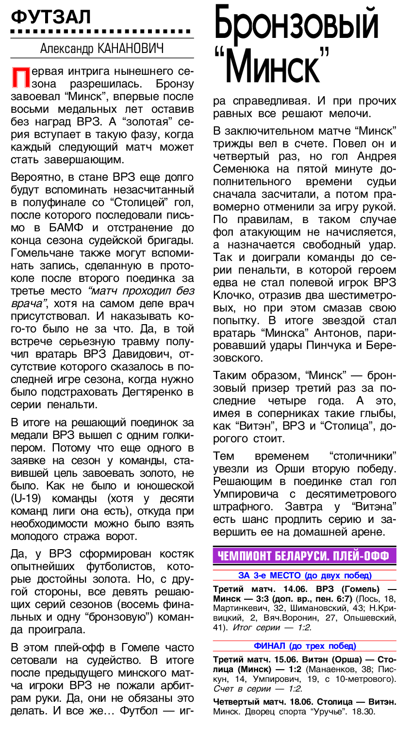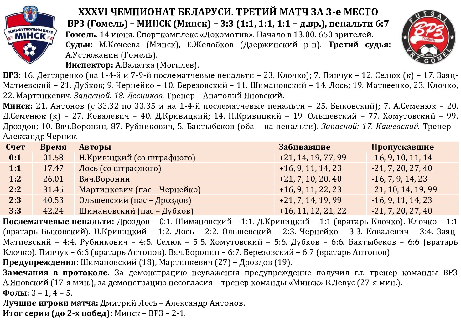 Подводим статистические итоги третьих финальных матчей (за 3-е и 1-е места) XXXVI чемпионата Беларуси по мини-футболу. По их итогам определился бронзовый призер, которым в третий раз за последние 4 года стал «Минск». На сайте МФК «Столица» публикуем полную статистику матчей «бронзовой» и «золотой» серий с указанием авторов голевых передач и показателей «плюс/минус», ссылки на видеотрансляции, а также списки лидеров среди бомбардиров, снайперов («гол + пас») чемпионата и стадии плей-офф, лучших игроков по системе «плюс/минус», материалы прессы, свежий выпуск телепрограммы «Ясно о мини-футболе». Вся информация о третьих матчах финальной стадии собрана под одним заголовком в одном месте!