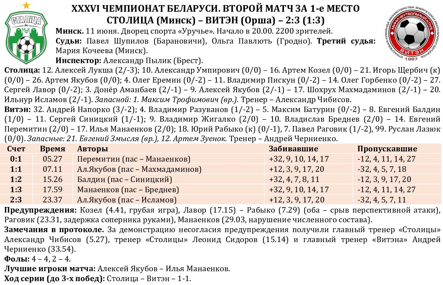 За 1-е место (до 3-х побед). Третий матч. 15.06. Витэн – Столица (Орша, Олимпиец, 13.00).