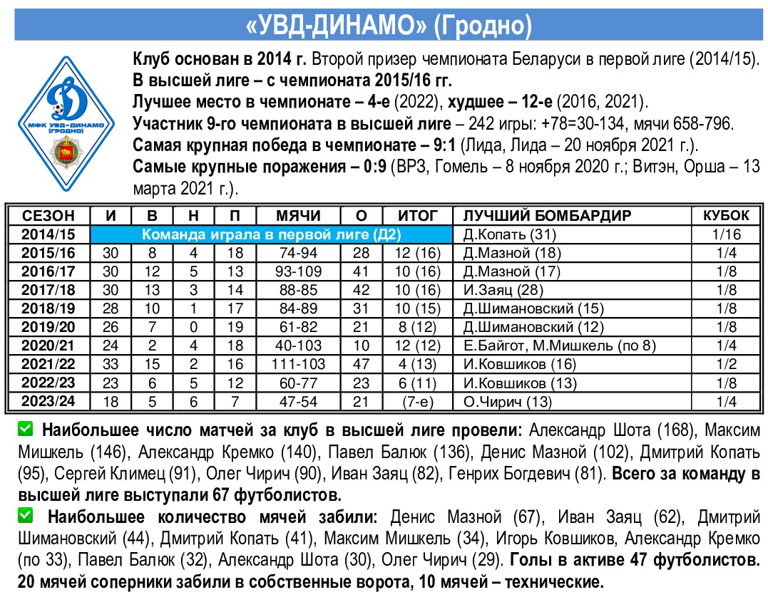 В рамках высшей лиги чемпионата Беларуси «Столица» и гродненское «УВД-Динамо» встречались 17 раз. В 15 матчах побеждали «столичники», в одном – гродненцы и еще однажды был зафиксирован ничейный счет. Причем очки соперник брал только на своей площадке. Разность забитых и пропущенных мячей 82-29 в пользу нашей команды.